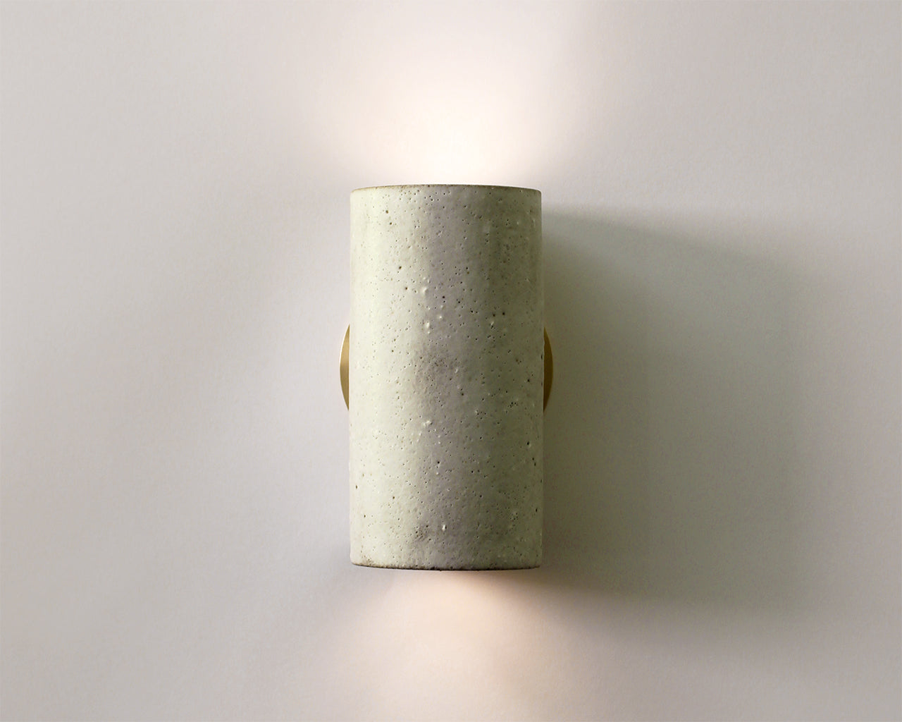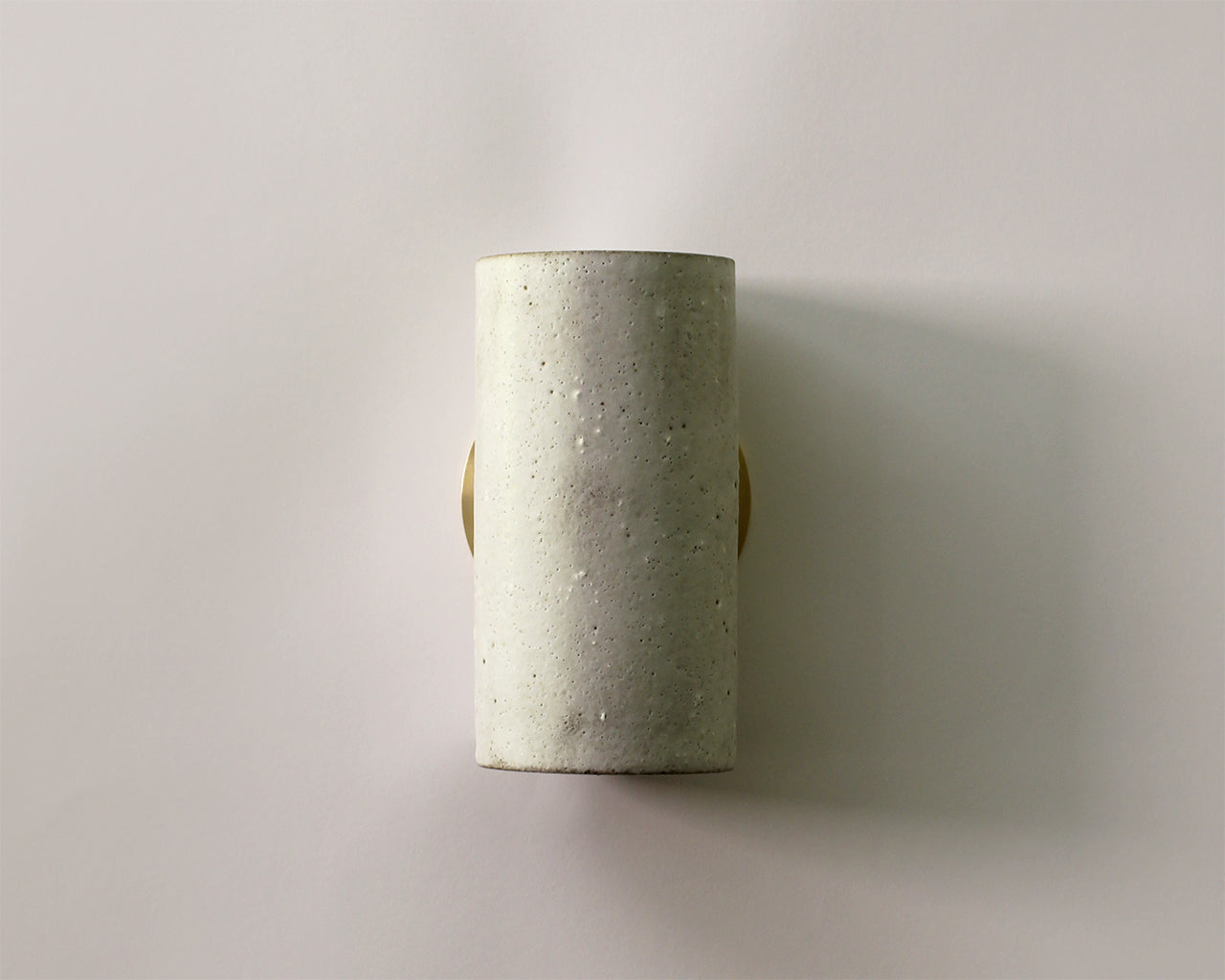 Cylindrical, wall-washing, stoneware sconce with a matte, white, pitted glaze. This sconce is one of a kind.