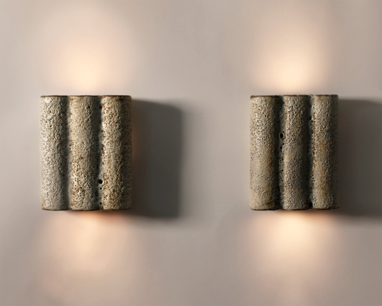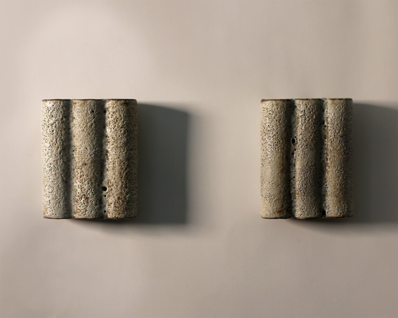 Multi-cylinder, stoneware sconce with a white, pitted glaze. This sconce is as a pair, one pair available.