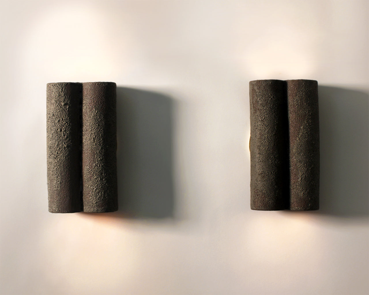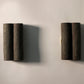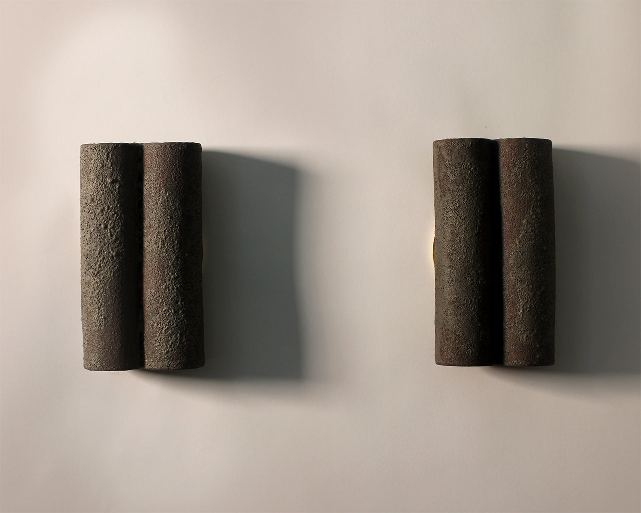 Double cylindrical wall sconce with speckled, dark gray glaze. Sold as a pair, one pair available.