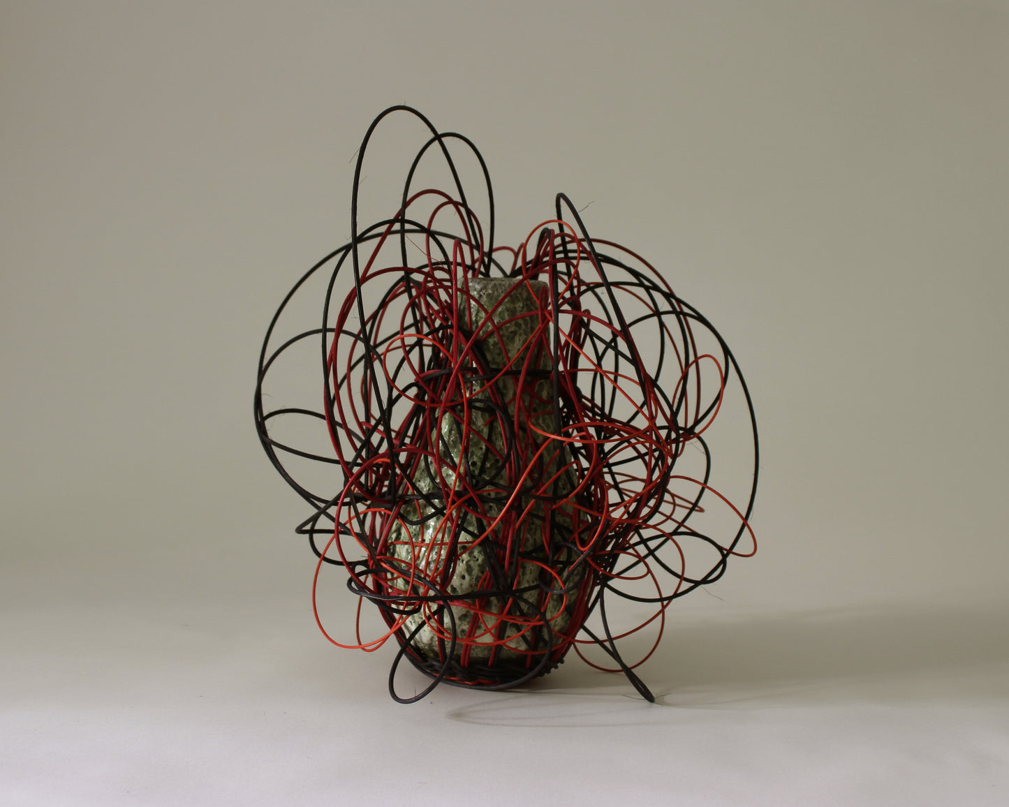 Stoneware vase with gray pitted glaze. This vase includes a woven element by Underwater Weaving Studio.