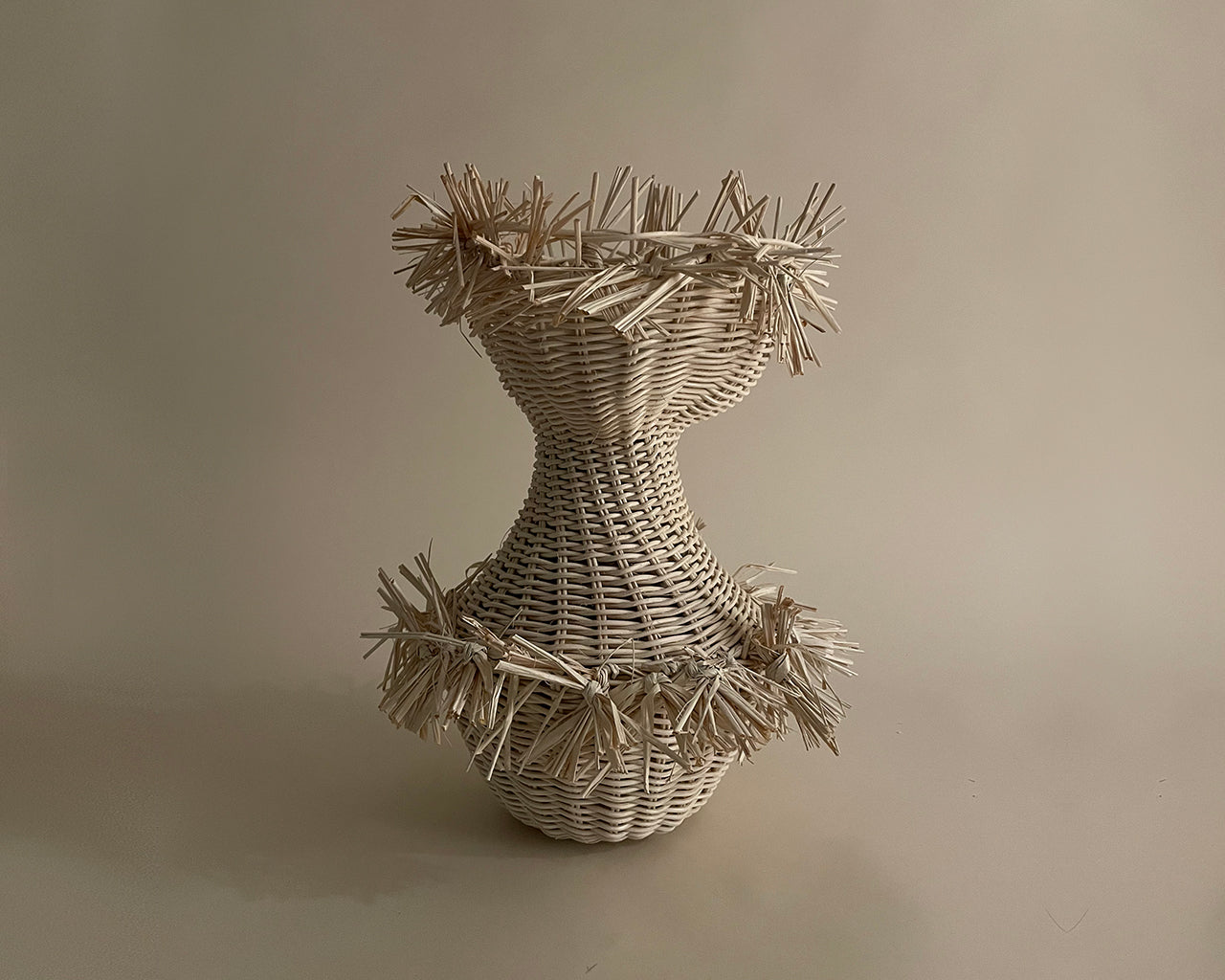 A ceramic vase finished with an off-white glaze fully wrapped with natural rattan and raffia details by Underwater Weaving Studio.